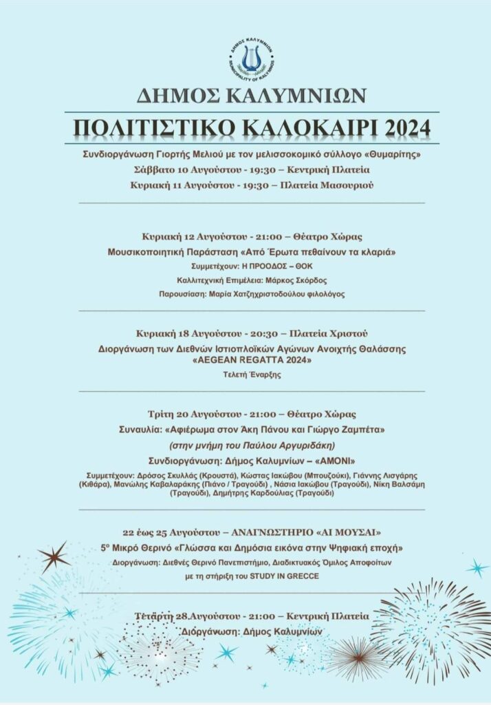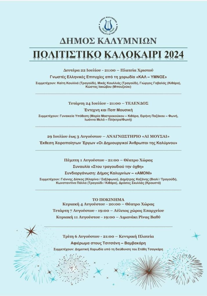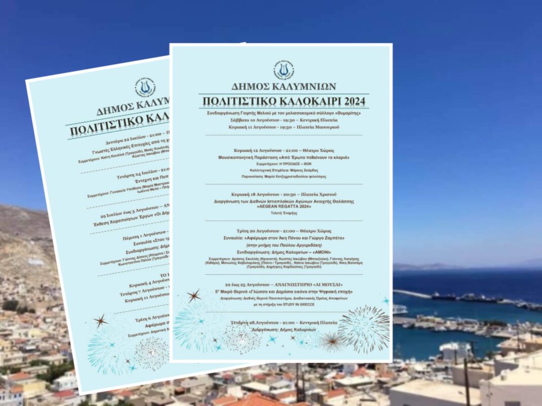 Δόθηκε στη δημοσιότητα το πρόγραμμα του Πολιτιστικού Καλοκαιριού 2024, που περιλαμβάνει τις εκδηλώσεις που διοργανώνει ο Δήμος, σε συνεργασία με φορείς και συλλόγους του νησιού.