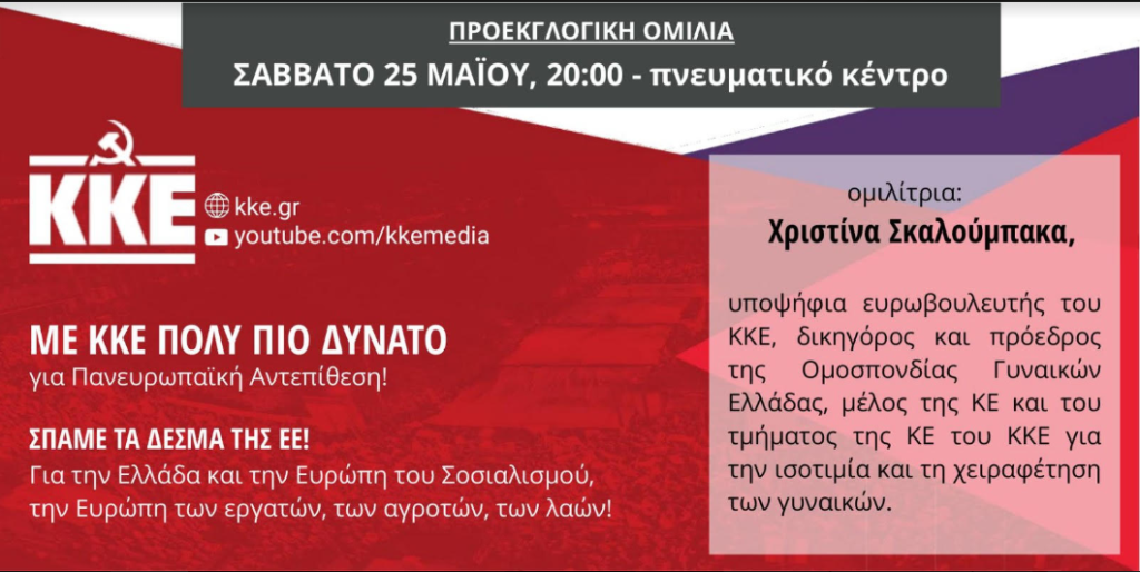 Ενόψει των Ευρωεκλογών της 9ης Ιουνίου στο νησί θα περιοδεύσει το Σάββατο 25 Μάη η υποψήφια Ευρωβουλευτής του ΚΚΕ Χριστίνα Σκαλούμπακα. Η Κομματική Οργάνωση Βάσης Καλύμνου του ΚΚΕ, απευθύνει πλατύ κάλεσμα σε όλους εργαζομένους, ανέργους, ελ.επαγγελματίες, νέους και νέες του νησιού στην Προεκλογική Συγκέντρωση - Ομιλία στις 20:00 στον χώρο του Πνευματικού Κέντρου.