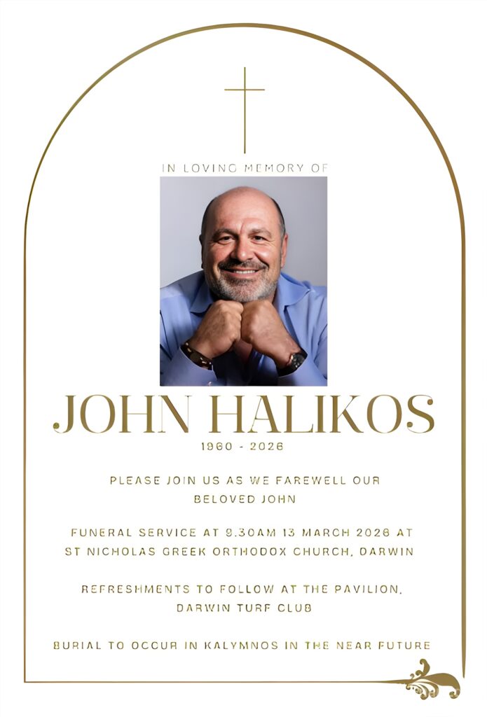 Μέσα σε κλίμα πένθους, η Καλυμνιακή Ομογένεια του Ντάργουιν της Αυστραλίας, θα αποχαιρετήσει το διακεκριμένο μέλος της και πρώην πρόεδρο της Καλυμνιακής Κοινότητας, Γιάννη Χαλίκο, στον Ι. Ναό του Αγίου Νικολάου, όπου θα ψαλεί η εξόδιος ακολουθία, για τον μεγάλο Καλύμνιο, που η μεγάλη του καρδιά τον “πρόδωσε” τόσο πρόωρα και απρόσμενα.