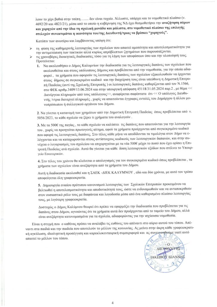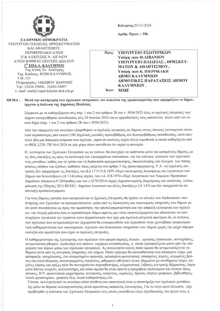 Ο διευθυντής του 1ου ΕΠΑΛ Καλύμνου, Γιάνης Ιακώβου, με επιστολή του προς τα αρμόδεια Υπουργεία, τον Δήμο και τις παρατάξεις του ΔΣ, παρουσιάζει με τον πλέον χαρακτηριστικό τρόπο, τα προβλήματα στη λειτουργία των σχολείων μετά την κατάργηση των σχολικών επιτροπών.