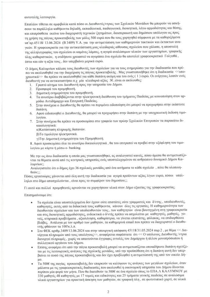 Με τον πλέον χαρακτηριστικό τίτλο, «Μετά την κατάργηση των σχολικών επιτροπών, τον κυκεώνα της γραφειοκρατίας που εφαρμόζουν οι δήμοι, έρχεται η διάλυση της Δημόσιας Παιδείας», ο έμπειρος διευθυντής της μεγαλύτερης σχολικής μονάδας του νησιού αλλά και της περιοχής, αναφέρεται στα εμπόδια από την γραφειοκρατία και τη δυσλειτουργία των διαδικασιών, που επηρεάζουν αρνητικά την όλη εκπαιδευτική διαδικασία, καθώς και την καθημερινότητα τόσο των μαθητών όσο και των εκπαιδευτικών.