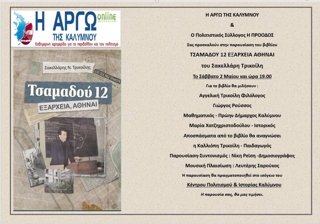 Ακολουθεί η πρόσκληση και ένα μικρό απόσπασμα για το ιστορικό βιβλίο του αείμνηστου Σακελλάρη Τρικοίλη, από την Αργώ της Καλύμνου και τον Σύλλογο “Η Πρόοδος”.