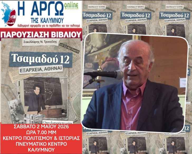Μετά την επιτυχημένη παρουσίαση του βιβλίου του αείμνηστου Σακελλάρη Τρικοίλη, φιλόλογου, συγγραφέα και εκδότη της εφημερίδας “Αργλω της Καλύμνου”, στην Αθήνα, το Σάββατο 2 Μαϊου 2026, θα γίνει και στην Κάλυμνο, στις 7.μ.μ. στο ισόγειο του Πνευματικού Κέντρου.