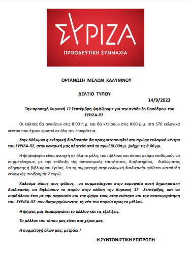 Την Κυριακή 17 Σεπτεμβρίου, θα διεξαχθούν οι εκλογές του ΣΥΡΙΖΑ ΠΣ, για την ανάδειξη προέδρου του κόμματος και η Ο.Μ. Καλύμνου καλεί τα μέλη, τους φίλους και όσους επιθυμούν να συμμετάσχουν, να προσέλθουν στο πρώην εκλογικό κέντρο στην Κεντρική Πλατεία.