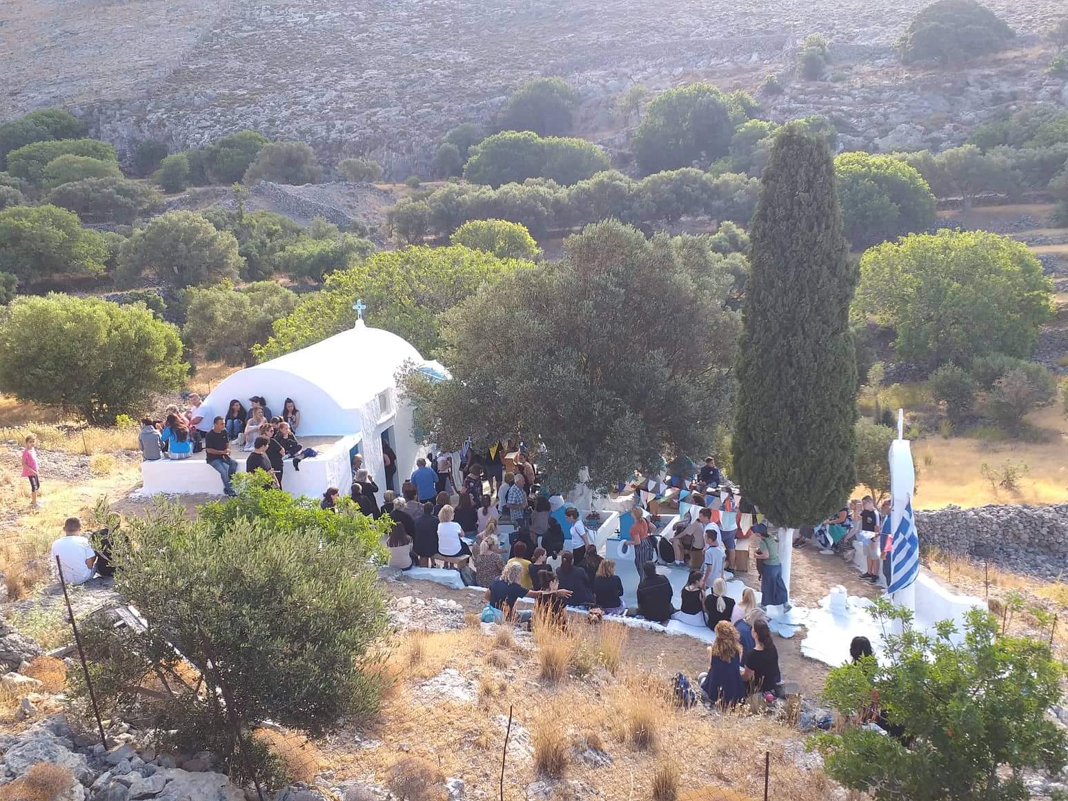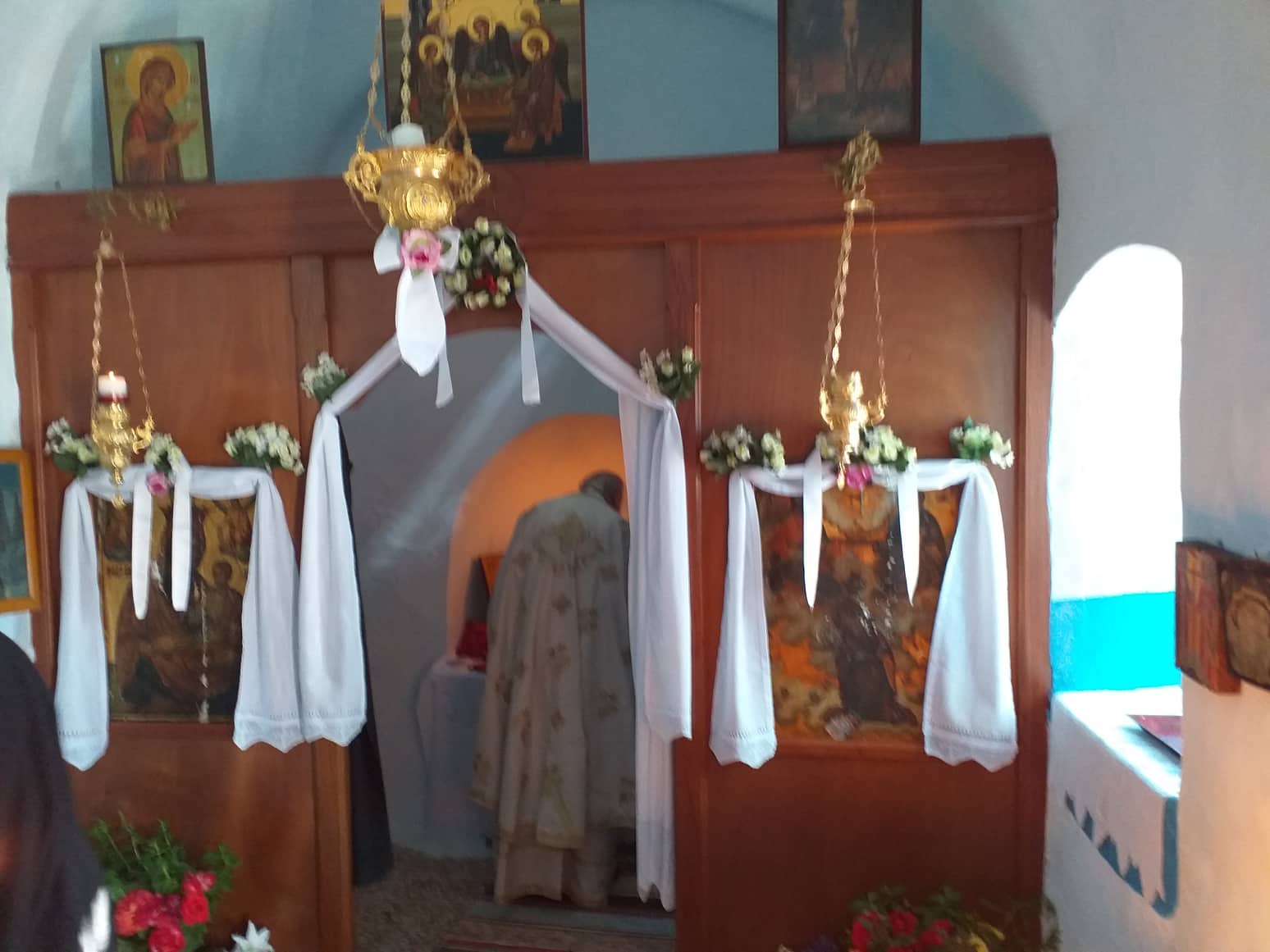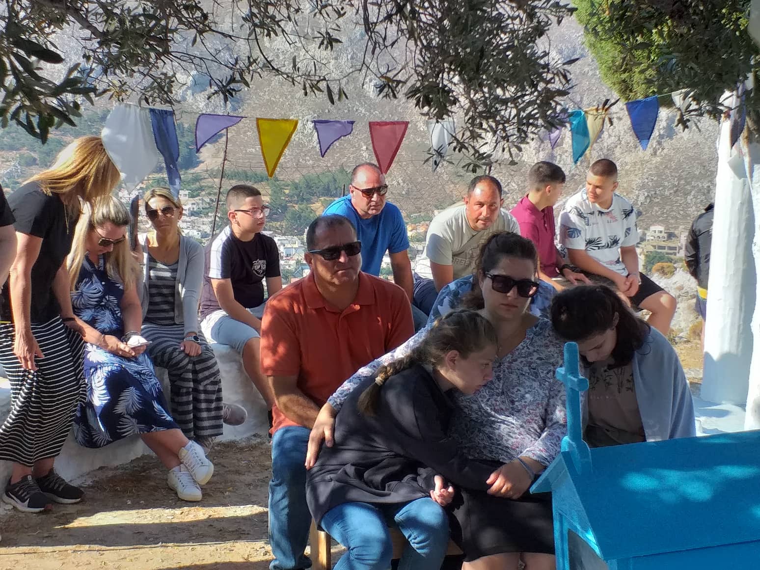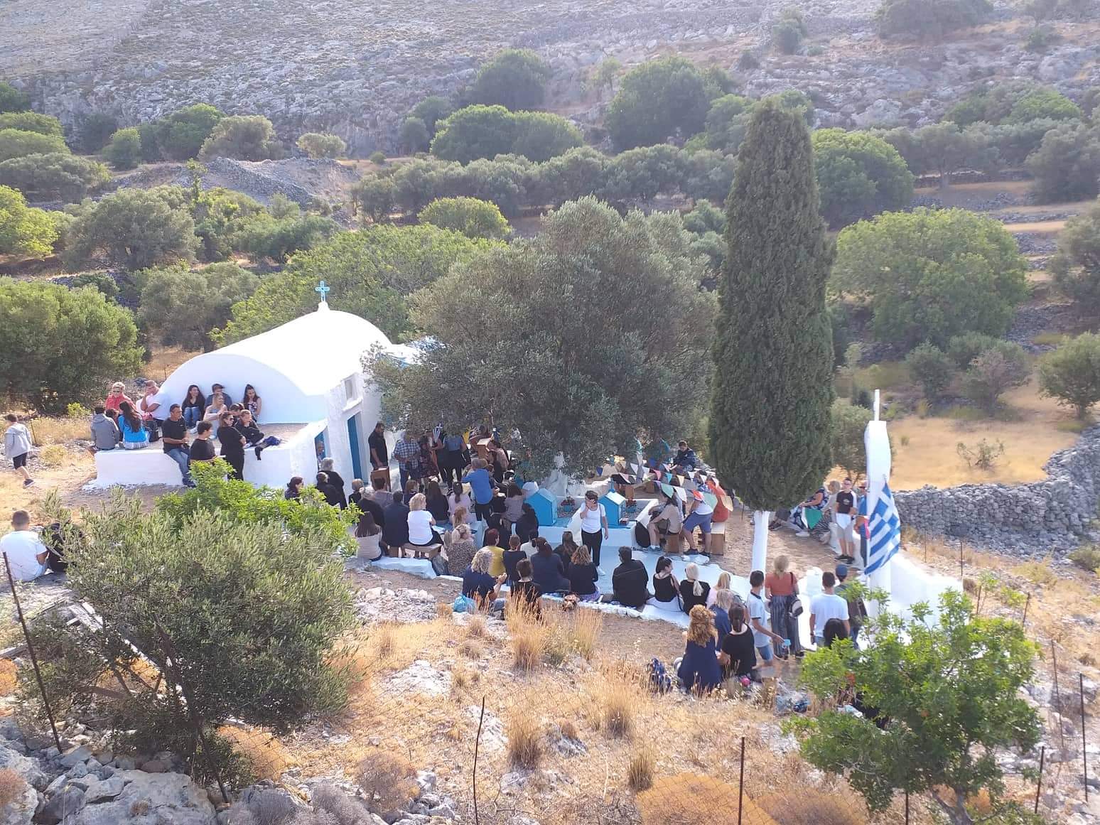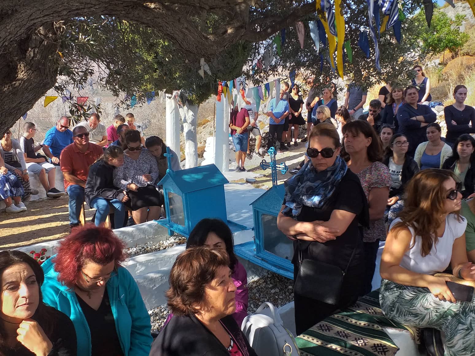 Οι σκηνές που κατέγραψε ο φακός του Νικόλα Μακαρούνα μοναδικές, καθώς μέσα σ’ αυτό το ιδιαίτερο τοπίο, με την πρέπουσα κατάνυξη και την παρουσία πολύ κόσμου, τελέστηκε η Θεία Λειτουργία του Αγίου Πνεύματος. Μετά το πέρας της Θείας Λειτουργίας, οι πιστοί δέχονται το παραδοσιακό τραταρισμα με καφέ, ψωμί ζυμωτό και Καλύμνικο τυρί, που παράγει η οικογένεια Κλήμη, με την ίδια παραδοσιακή συνταγή εδώ και πολλές δεκαετίες.